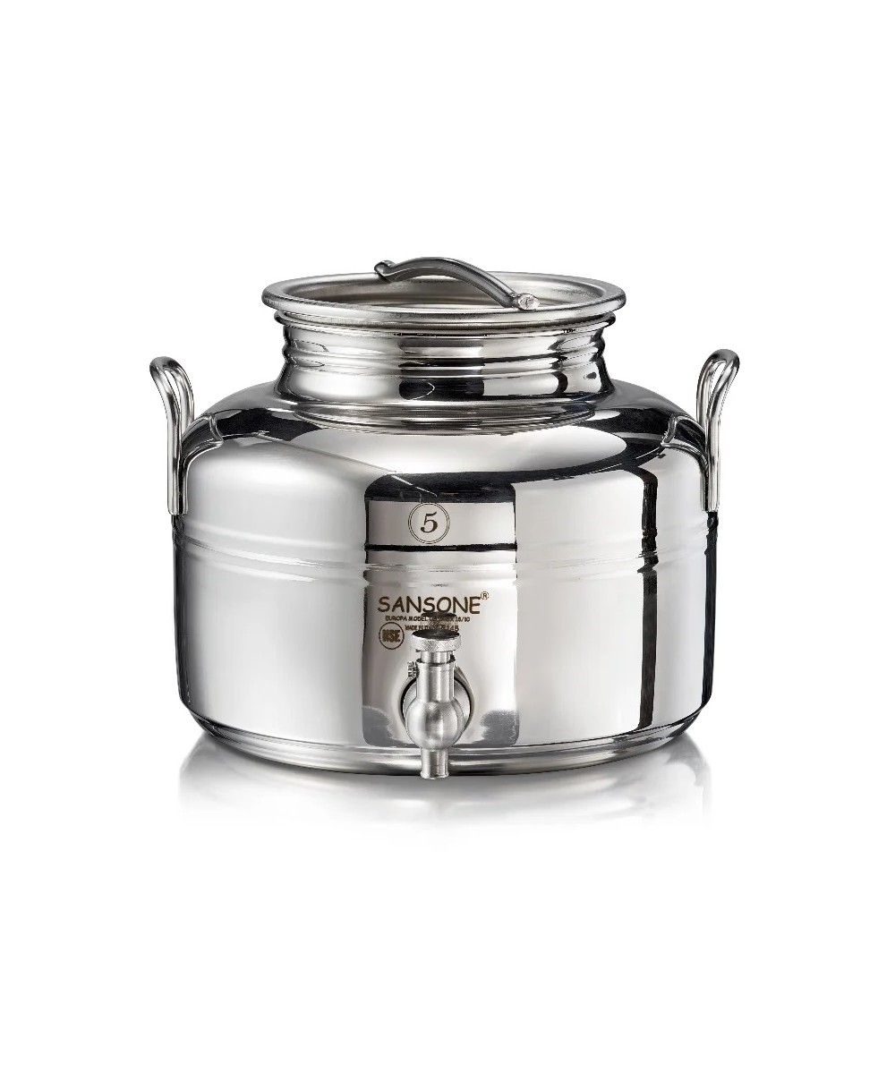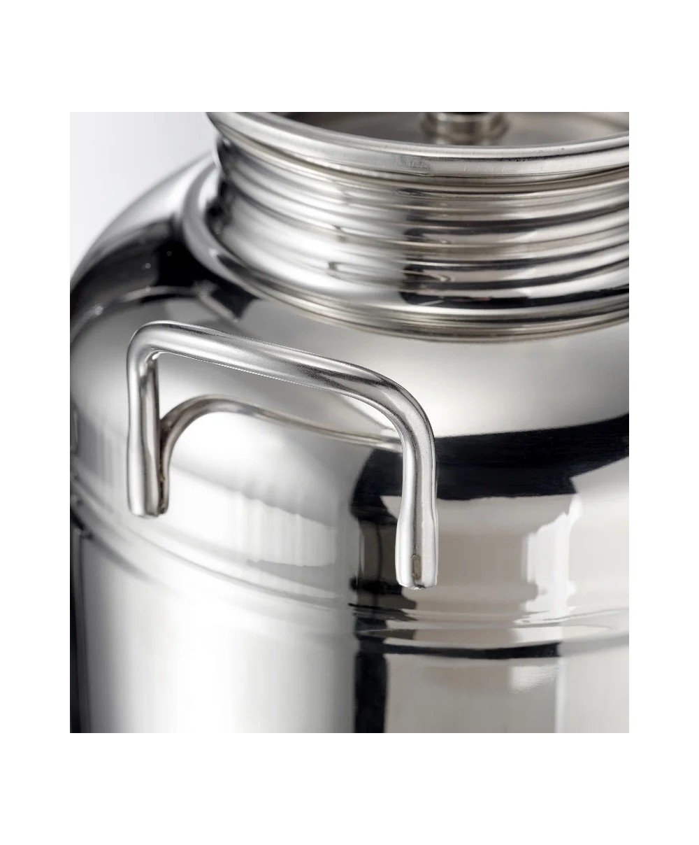 Il fustino in acciaio inox 18/10 – Aisi 304 ideale da tenere in cucina viene fornito in una confezione singola corredato da un rubinetto salvagoccia ed un supporto in pvc. Il materiale utilizzato tutto di prima scelta è Acciaio inox 18/10 – Aisi 304