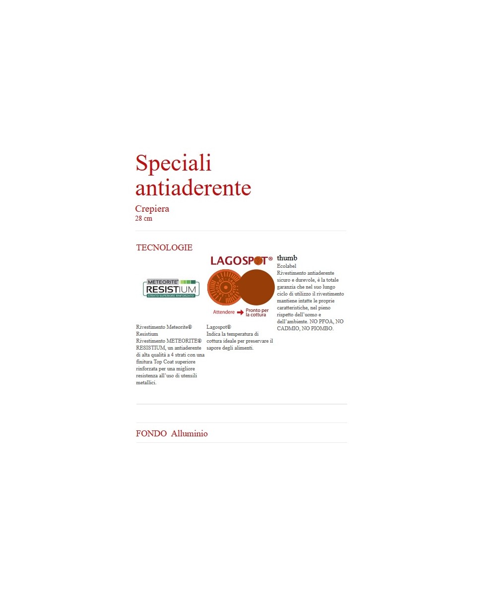 La Crepiera presenta un'ampia superficie interna e il bordo basso per favorire la stesura perfetta e la cottura uniforme: sono l'ideale per cucinare piadine, crepes e frittate.Il corpo è realizzato in alluminio, che diffonde perfettamente il calore sulla superficie, rivestito con materiale antiaderente per non fare attaccare i cibi. Il fondo è tornito e antiscivolo per una maggiore sicurezza durante le cotture. La Crepiera è dotata della tecnologia Lagospot® per una cottura perfetta.