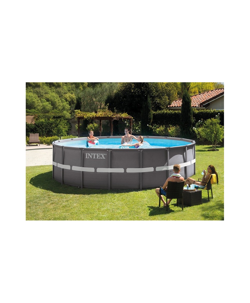 Le piscine Ultra Frame di Intex sono la combinazione tra la massima qualità della struttura e del sistema di filtrazione dell'acqua. 26324 è la piscina fuori terra rotonda della serie Ultra Frame con dimensione: 488 X 122 cm. È dotata di pompa filtro a sabbia, scaletta, telo base e telo copertura.