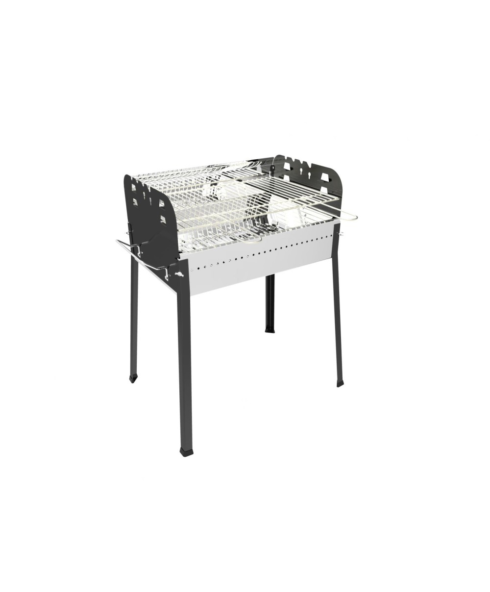 Barbecue rettangolare a carbonella realizzato in acciaio inox, con gambe e fianchetti verniciati, e dotato di una griglia cromata per alimenti da 56×35 cm.