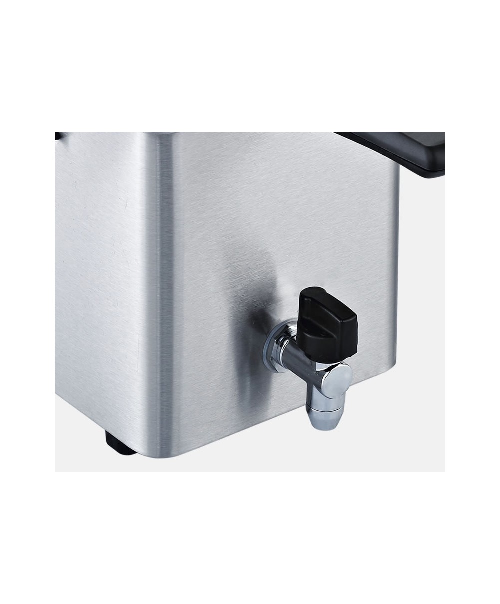 Friggitrice elettrica professionale RGV da 3/4 litri in acciaio inox, ideale per uso domestico e ristorazione rapida. Facile da pulire e smontare, con rubinetto per scarico olio e design robusto e sicuro. Perfetta per fritture uniformi e veloci.