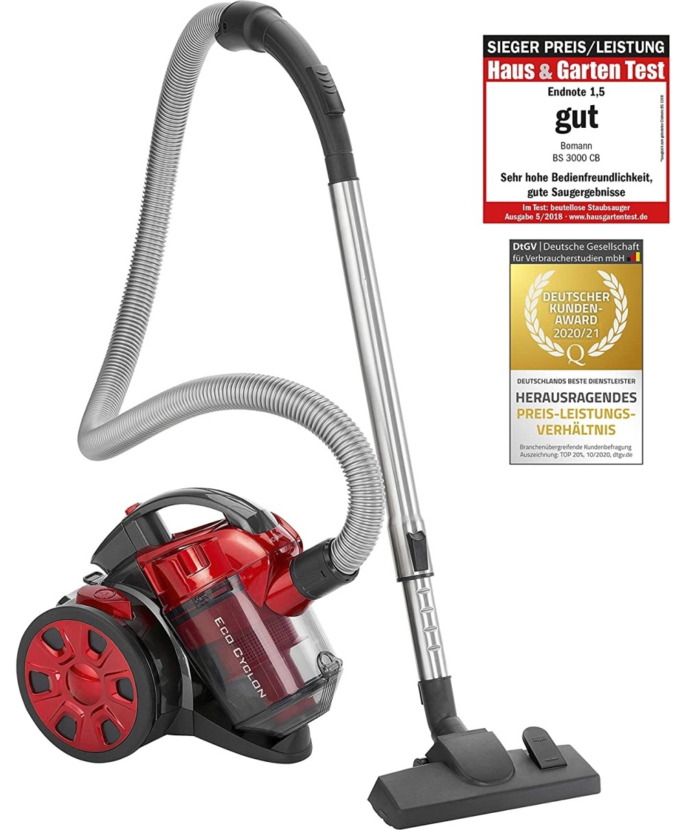BS3000CB è l'aspirapolvere multiciclonico compatto senza sacco di Bomann ideale per pavimenti duri, tappeti e mobili con imbottitura. Nessun costo aggiuntivo per sacchi e filtri