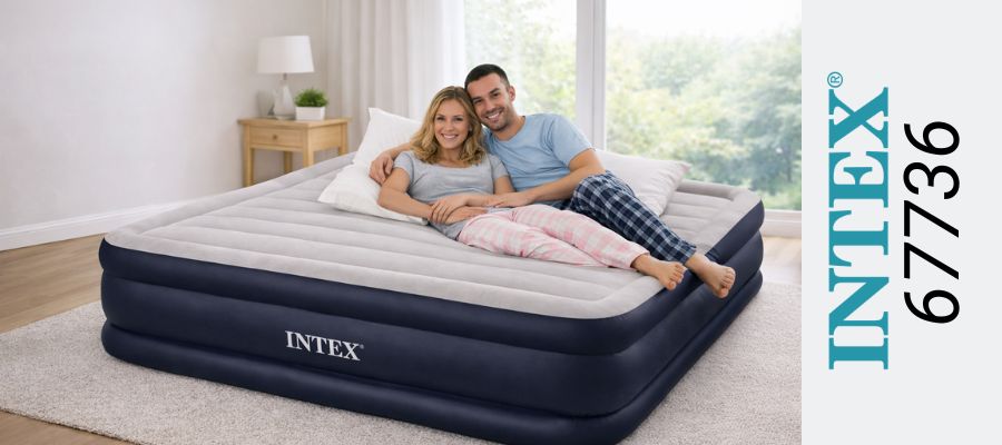 Il letto matrimoniale Intex 67736 è costituito da un materasso gonfiabile bicolore con cuscino presagomato e superficie water-proof.